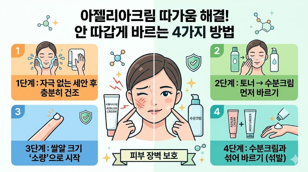 이는 성분이 피부 속 여드름균과 염증에 작용하고 있다는 신호이기도 하지만, 피부 장벽이 약한 분들에게는 큰 고통이 될 수 있습니다. 다행히 이 따가움은 피부가 성분에 적응하면 보통 1~2주 내에 서서히 사라집니다. 하지만 적응 기간을 견디지 못하고 포기하지 않도록 아젤리아크림 사용법의 디테일이 필요합니다.
